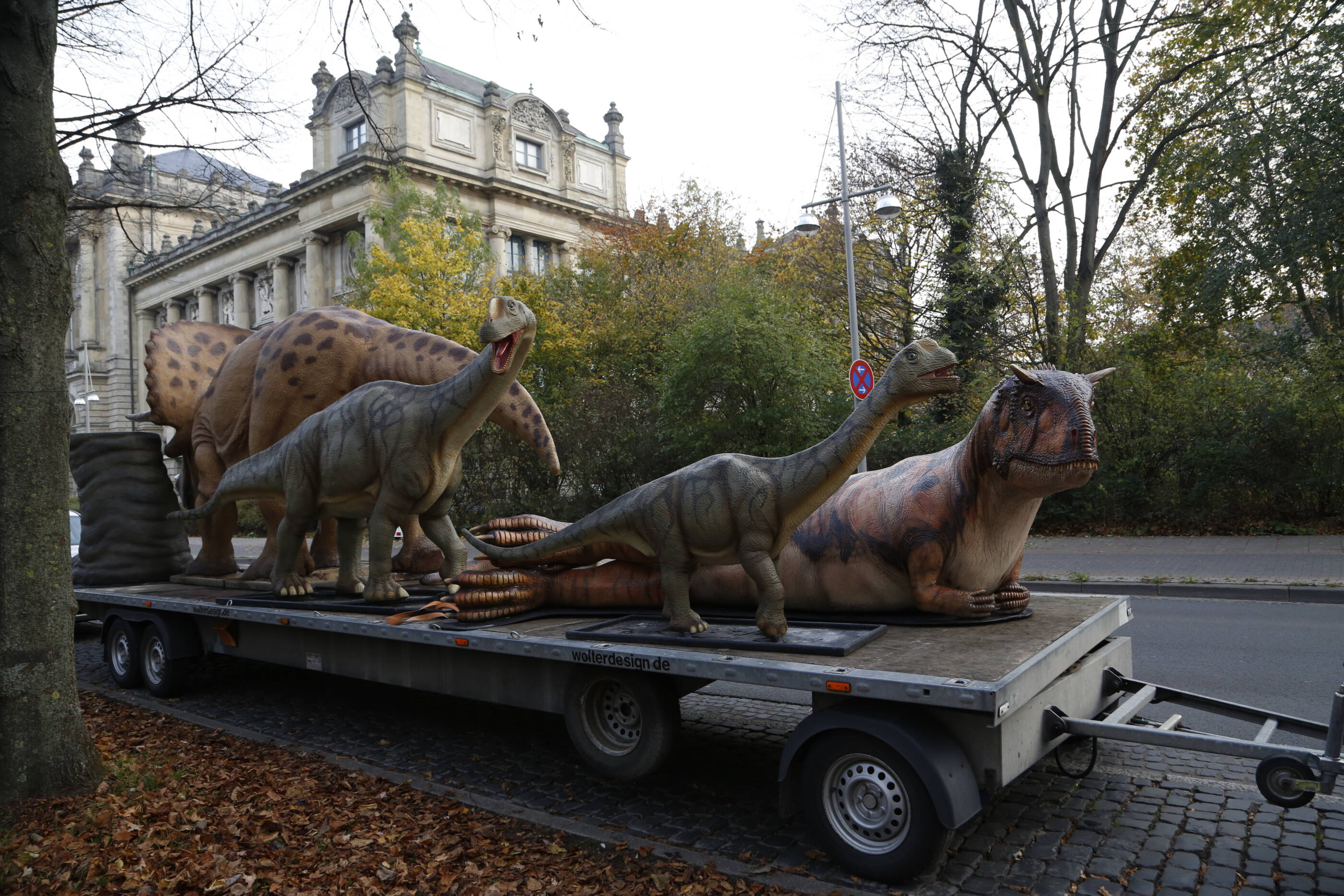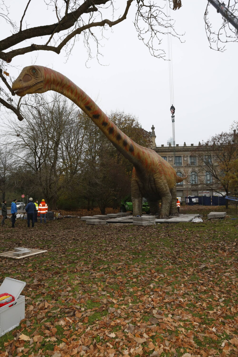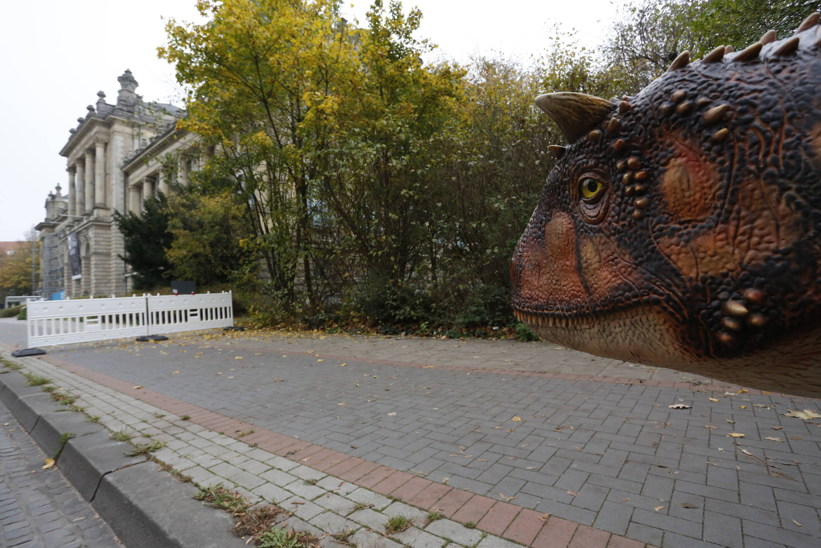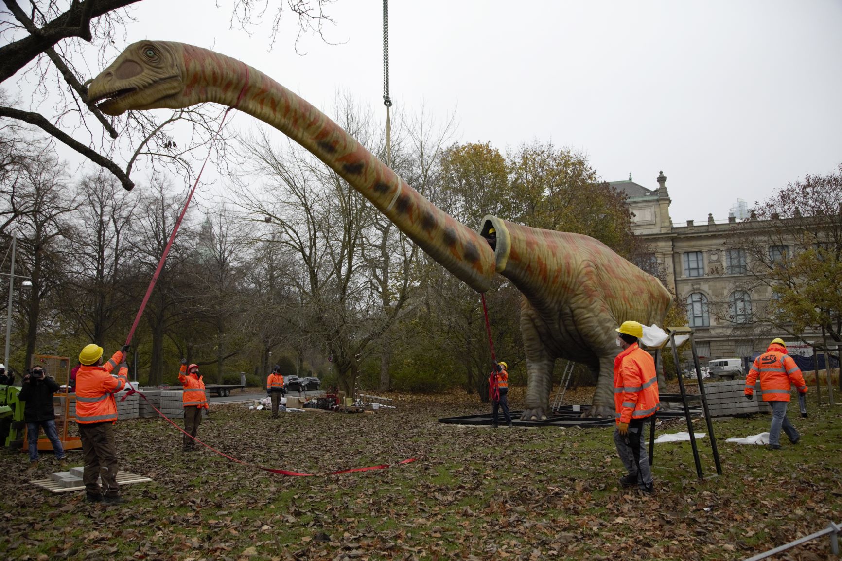 Anlässlich der kommenden Sonderausstellung »KinoSaurier. Zwischen Fantasie und Forschung« wurden auf dem Außengelände des Landesmuseums Hannover drei lebensgroße Dinosauriermodelle aufgebaut. Darunter befindet sich auch das Modell eines 45 Meter langen Seismosaurier aus der Gruppe der Sauropoden.